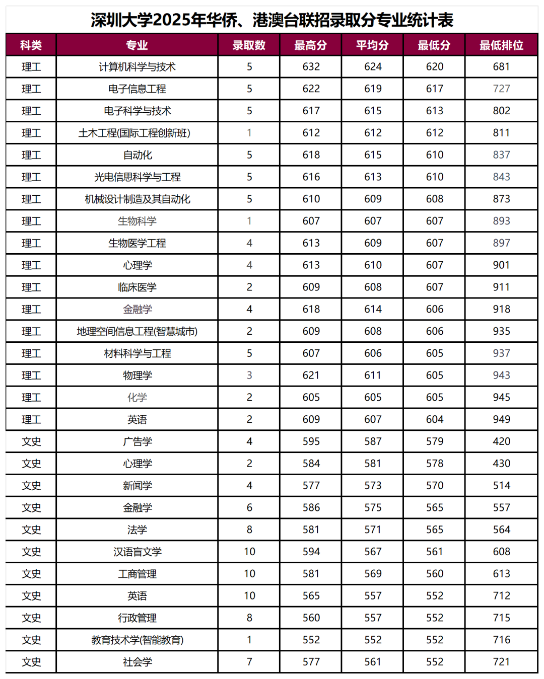 2025年港澳台联考的竞争再度升温,深圳大学作为大湾区热门高校,自然成为许多学生的心仪选择。理工类最低录取分604分(排位949名),文史类最低录取分552分(排位721名)。