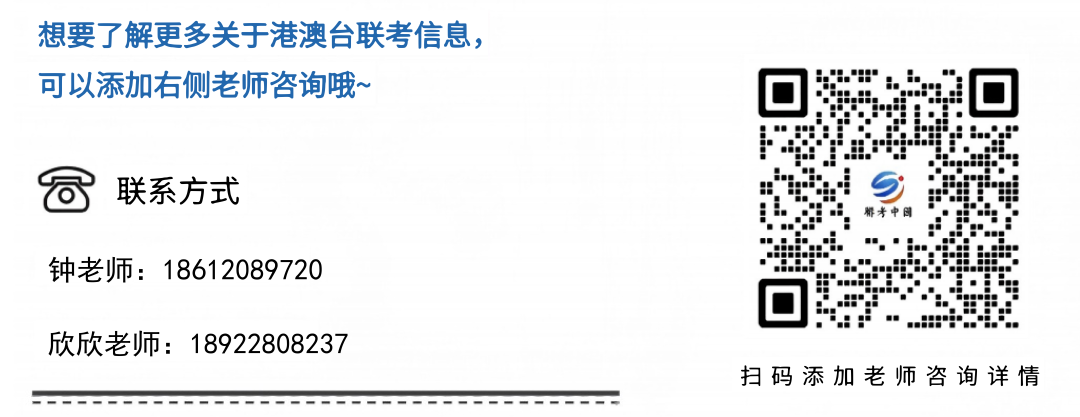 联考路上不孤单,资深老师在线答疑,助力港澳台学子圆梦内地高校!了解更多港澳台联考信息,可以扫描下方二维码添加老师咨询详请,或拨打老师咨询热线:18612089720