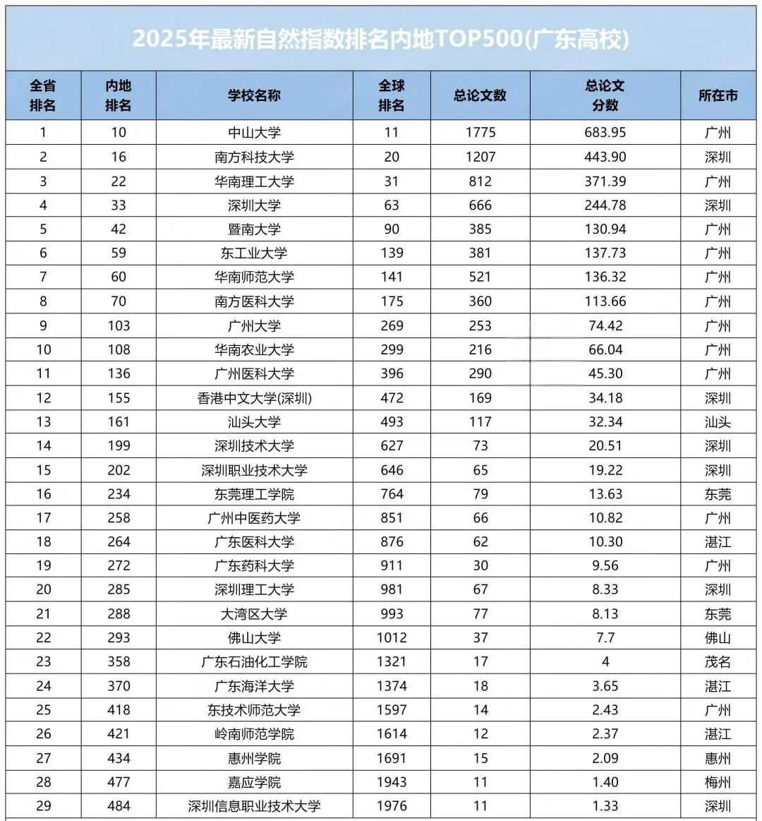 在最新榜单中,广东上榜的29所高校呈现明显梯队化特征。
