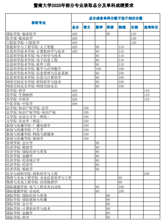 2025年两校联考暨南大学普通类专业4科总分要求不低于380分,华侨大学第一志愿4科总分不低于330分;两校艺体类专业分数要求4科不低于270分。